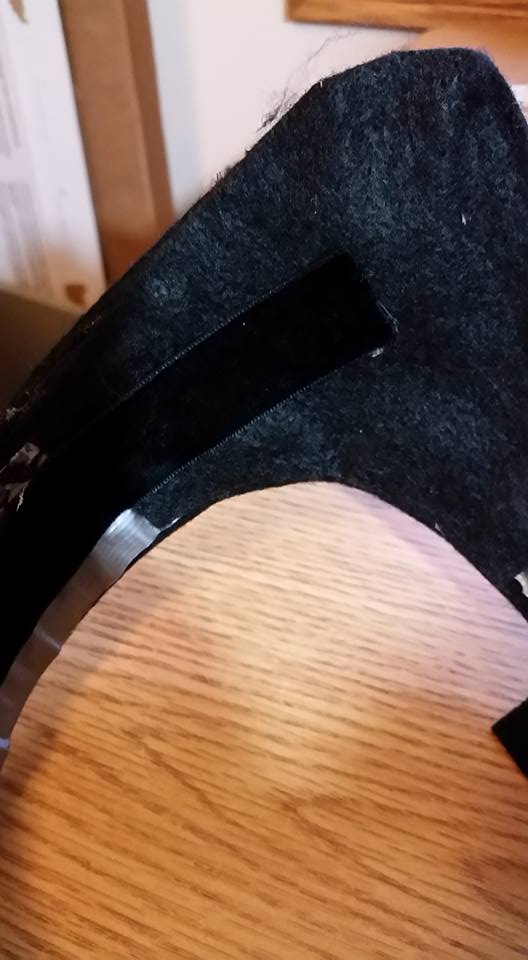 Next, I cut out a piece of felt (actually, done in two pieces as I was using cheap 8 x 11 sheets of 4/$1 craft store felt) that was larger than the paste (similar to the process of covering the visor with fashion fabric). I used pieces of duct tape and taped the felt around the paste to cover it. If you do this, trim the felt so that you are taping felt-to-duct tape and not felt-to-felt, as that stays better. When that was done, I ran one reinforcing piece along the length of the paste, covering all of the small pieces.