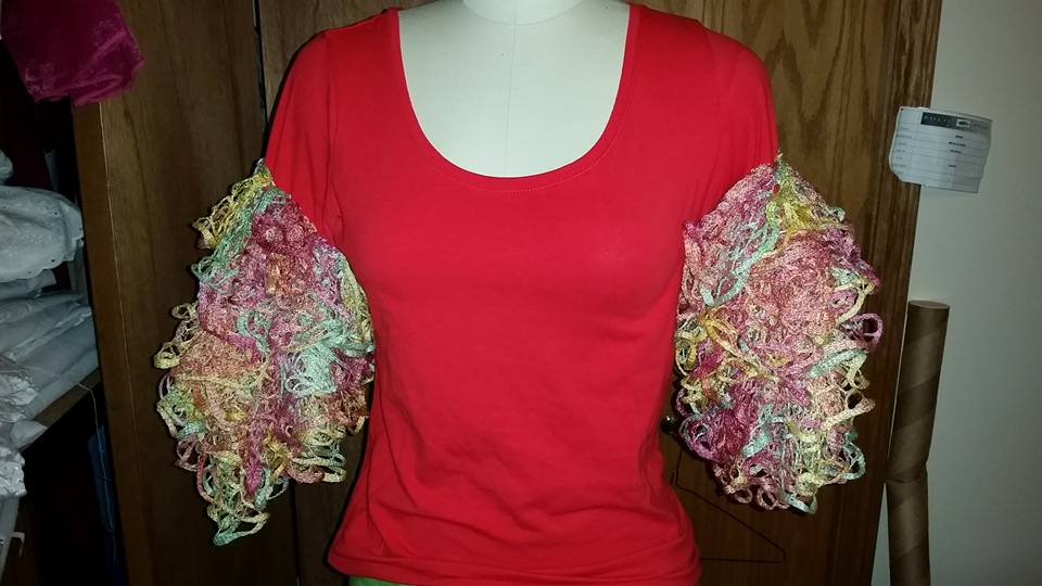 The first thing I did was to try to sew a ruffle scarf on to the sleeves of the shirt. Great plan. However, the sleeves on this particular shirt were too narrow to fit on the free arm of my sewing machine. Since the scarves did not lend themselves to cutting into pieces, I wanted to sew them to the sleeves in a spiral going up the sleeve.
