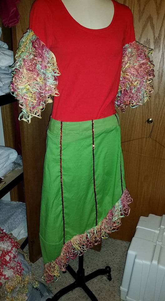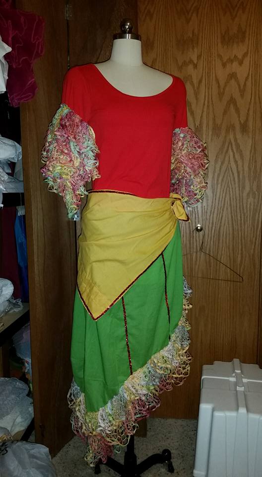 Then, my daughter and I went to a show and they had Conga Dancers. They were great costumes. Brightly colored long-sleeved shirts, with ruffles on the sleeves, worn with white pants. Very simple. Very effective. I thought “Hmmmmm . . .ruffles”.