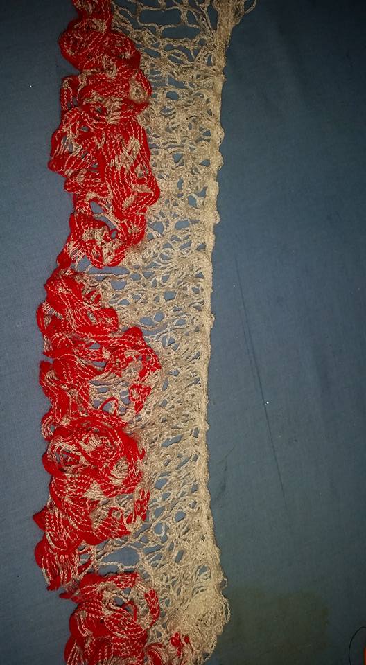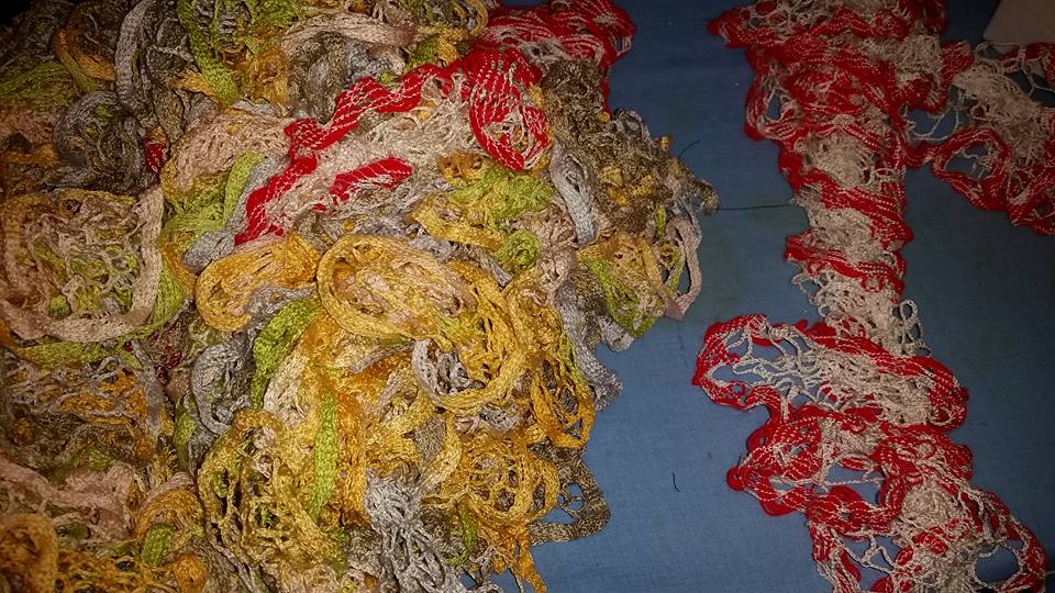 The last time I was there she had TONS of those crochet ruffle scarves, with multiples that matched. . . and of course it was a challenge to think of how to upcycle them.