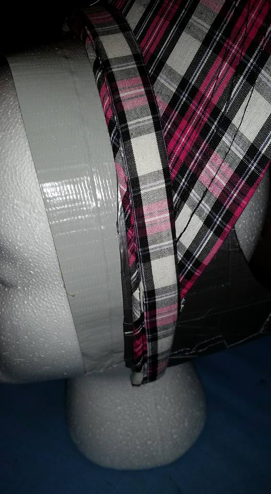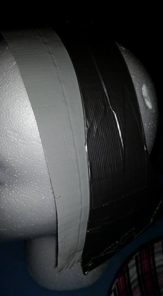I then put a long strip of duct tape on my styrofoam head and stuck the paste to it, and then put the visor on top of that.