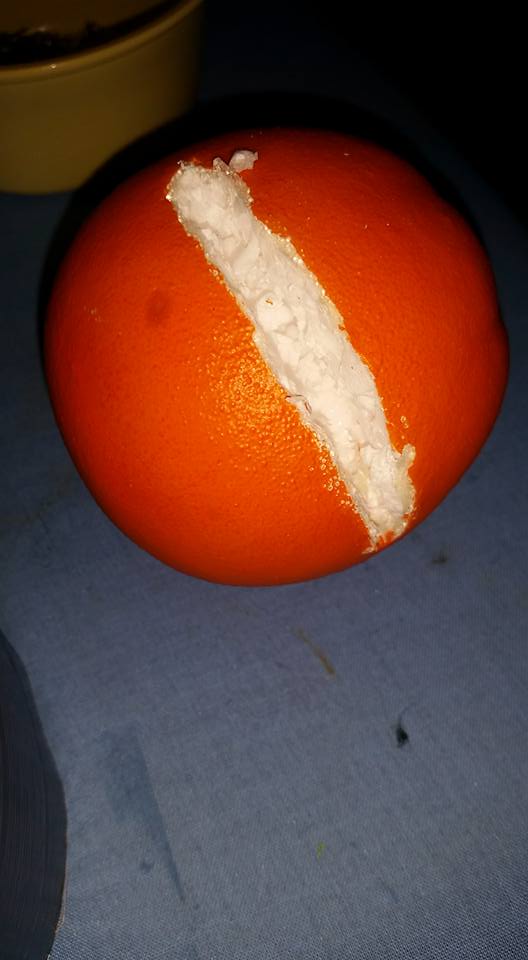 The oranges were by far they easiest. They were styrofoam, and so I cut wedges in them and glued them to the edge of the visor.