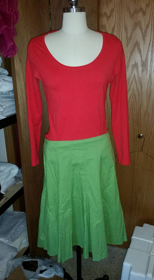I went thrifting and found a red long-sleeved t-shirt and a green skirt that I thought would coordinate with some of the scarves that I had.