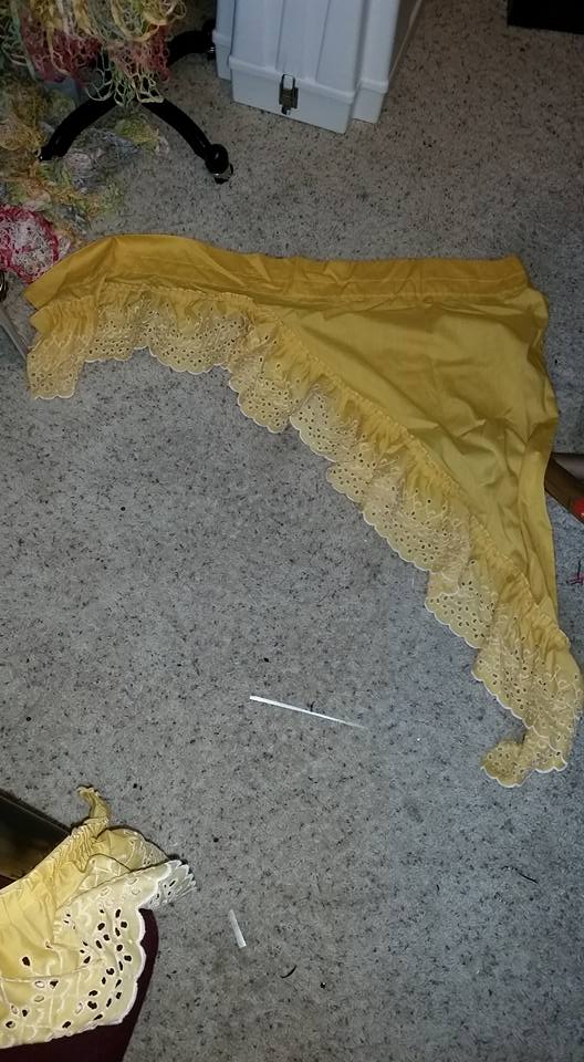 I had recently seen a show that had a 1960’s/70’s Hippie-genre costume and the bell bottom jeans had ruffles along the bottom. I thought “I bet those scarves could be ruffles”.