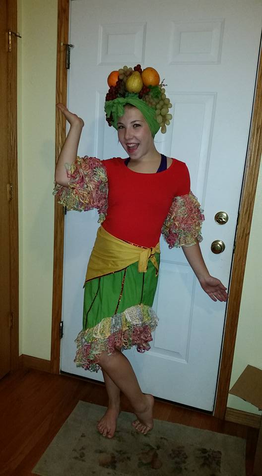 Evaluation: I hate ruffle scarves and don’t plan to ever use one again (but don’t let me stop you from trying!)* A fairly straight skirt works fine to make a Conga-type skirt, especially if you are using something else for ruffles. The contrasting hip wrap adds a lot. The hat worked REALLY well, aside from the weight. Who knew a fruited-french-hood was even a thing? I also realized, that if I had wanted the skirt to sit asymmetrically on the waist, I should have put the sequins on at an angle. Since the lines of sequins are straight up and down, if you tilt the skirt sideways they look really stupid.\