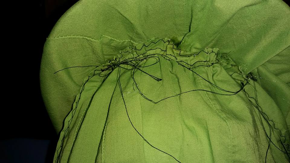 For the “veil”/”wrap”, I hemmed the edge (with poor tension), gathered the top edge, and glued it to the back. I was not concerned about threads showing as I planned to cover it with fruit.