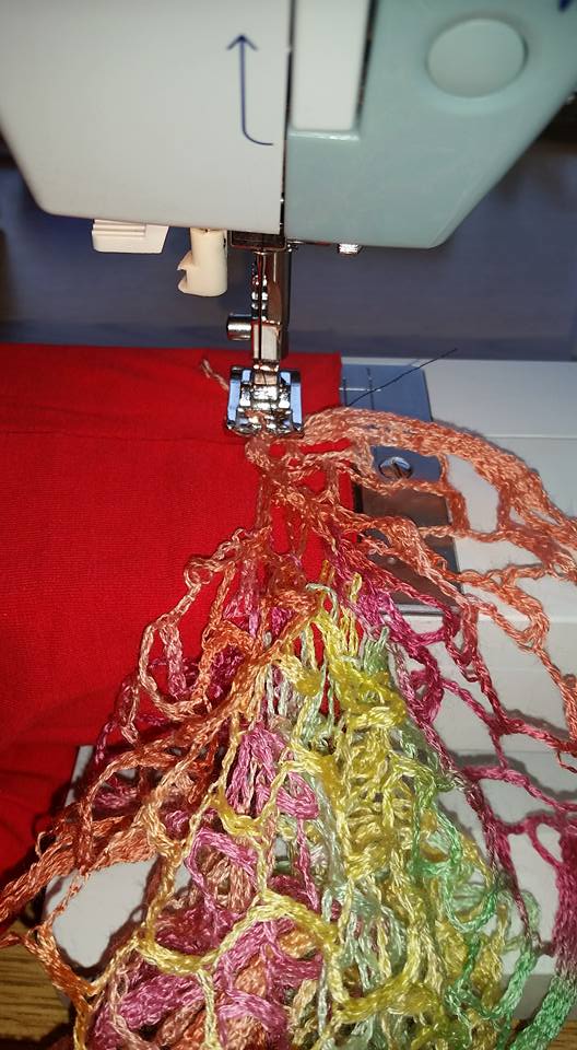 Now to sew the scarves on. Let me tell you, these scarves are MISERABLE to sew on. First, when I “imagined” doing this, I thought I would be able to untwist the scarves so that I would have a straight line to sew, and the ruffles would sort of fall around . . . nope. The ruffles really do spiral around the center, and I couldn’t figure out how to untwist it. That meant I just sort of folded the scarf in half along the center and zig-zagged the ruffles down as they happened to come along. Second , all those loops! They caught on EVERYTHING! On the presser foot! On the edges every screw, lever and loose edge on the machine! (and there are more than you think). I was soooooo frustrated. (Updated addendum: see note at the end of the shirt section).