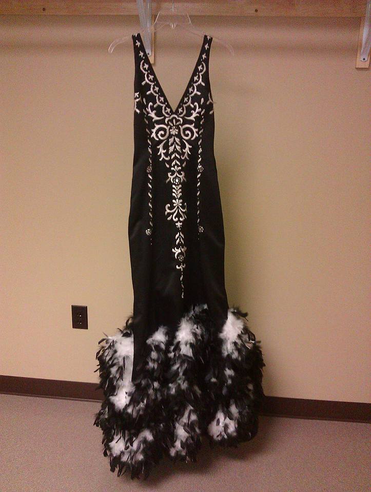 I purchased several black and white turkey feather boas and they were pinned to the bottom of the dress. This way they can be removed for washing.