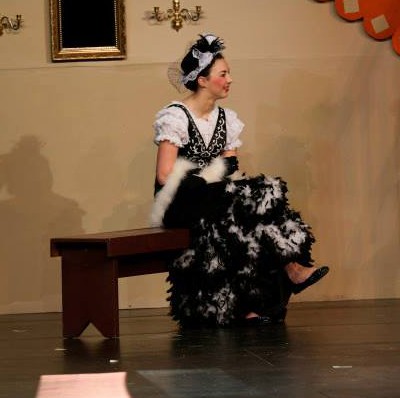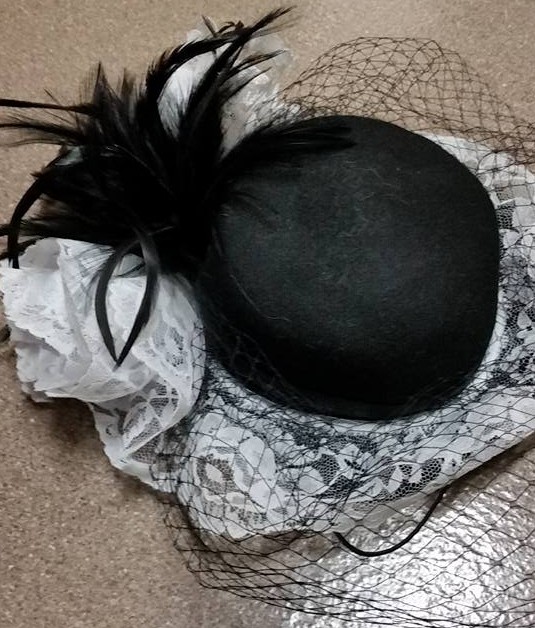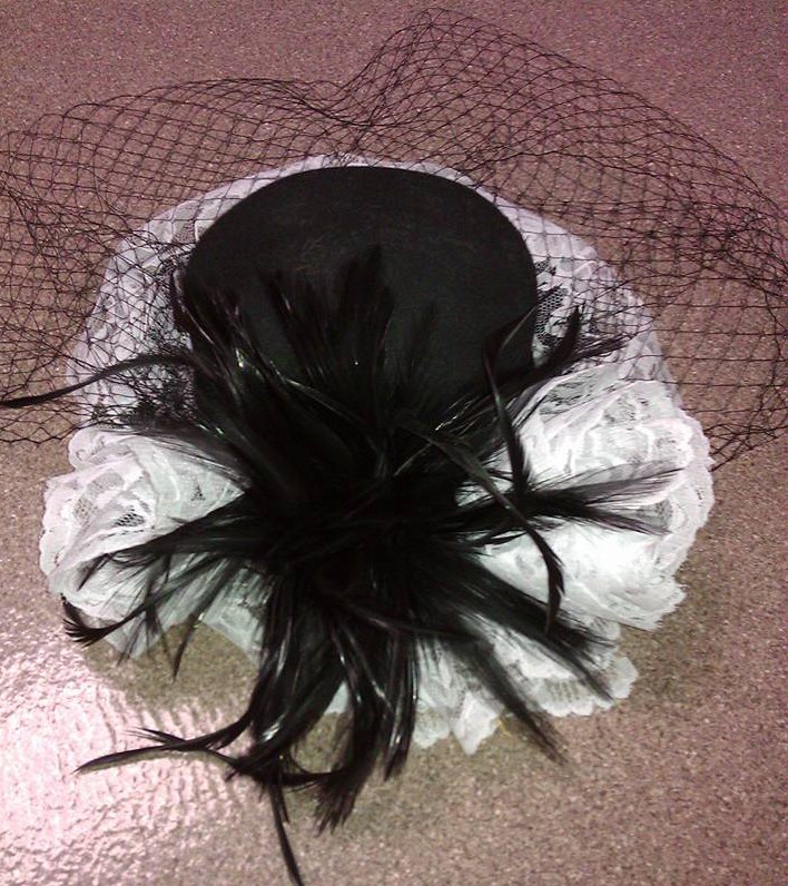 For the maid hat, I had found a little black fascinator style hat that had black feather and a black veil. I added some white lace in a ruffle around the hat and some extra puffs at the back, just for visibility on stage and to set the feathers off. To complete the outfit she wore long black gloves.