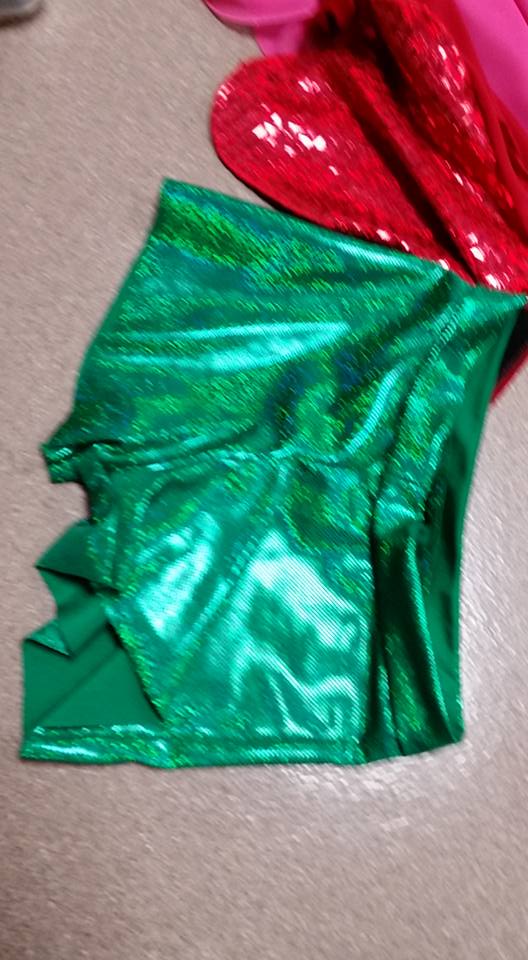 To finish off the outfit, I made green sparkly shorts out of a spandex fabric. I cut the pattern off of a pair of shorts the cast member already owned.