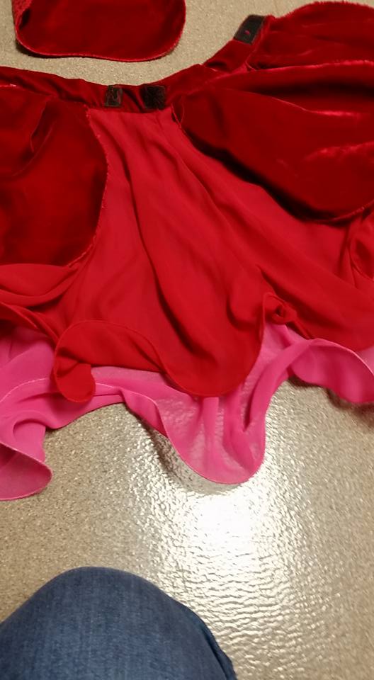 The idea behind this costume was that it was the personification of the rose, so I made a waist belt with attached petals. I made the outside of the petals velvet with a sparkly fabric on the inside. I also edged these with fishing line to give them some body. These were sewn to the waistband, with one of them attached with velcro so that it was removable (I would use magnets if I did it again to avoid the tell-tale “rip” of the velcro). This worked out really well . . . and make for a fun interpretation of this section of the show.
