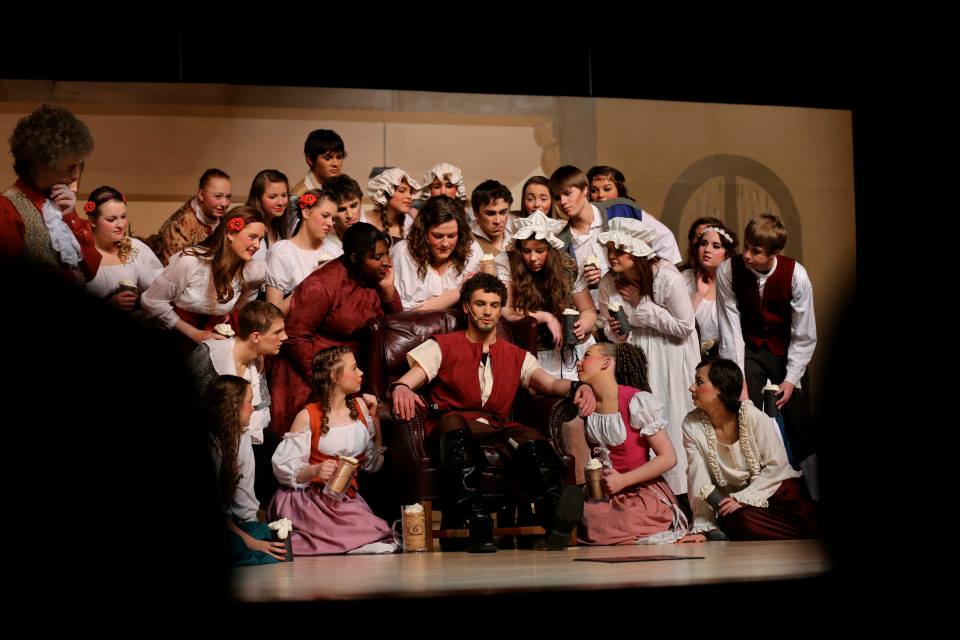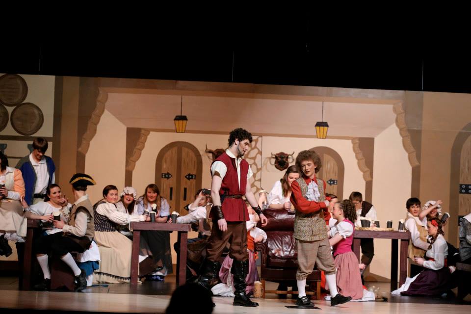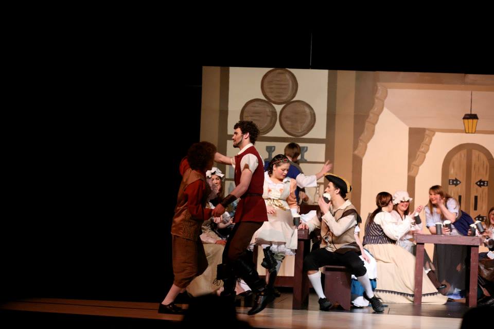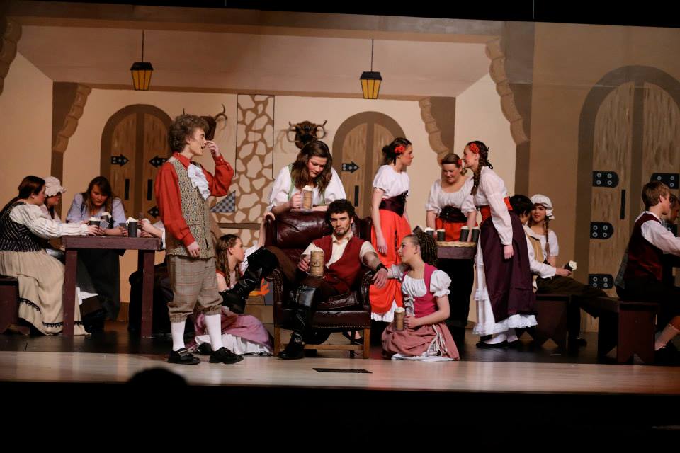 The first time the girls did their little dance with their trays, as they finished and started returning to the “group”, the chorus members started grabbing “mugs” covered with “foam”. Suddenly, what had been a pretty flat scene . . remarkably . . . they ALL perked up. They smiled, they interacted, they drank their ale, the song gained life and the tavern came alive. But what was even better was that they began to step it up and be creative in their own right . . .someone brought a deck of cards, a few of them started walking around the stage to talk to friends, they began to ACT.