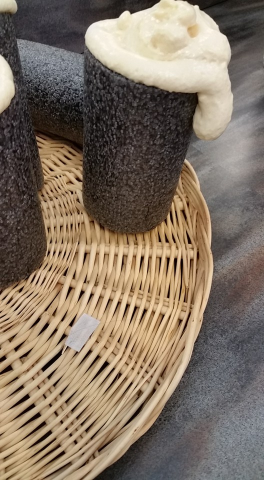 I cut the tubes in about 6″ lengths, and used expanding foam insulation (the kind that comes in a spray bottle with a skinny nozzle to squirt it into cracks) and sprayed “foam” on the top of the “mugs”. I didn’t have handles on them, but I thought, just sitting on the trays, it didn’t really matter.
