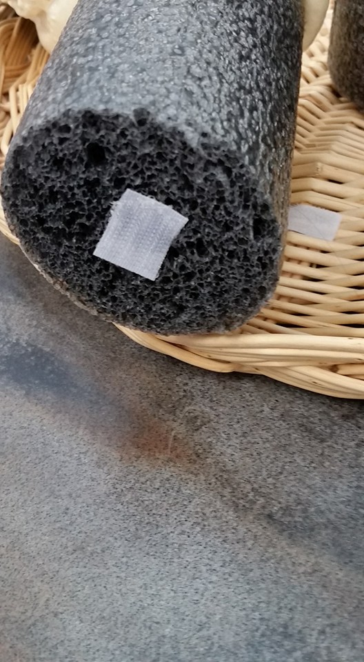 I did find some wicker trays, which were definitely better than the other ones I’d been finding. And, as I was trying to figure out how to paint/create something pewter looking, I recalled we had some leftover gray stiff foam tubes that had been donated for a different costume project.