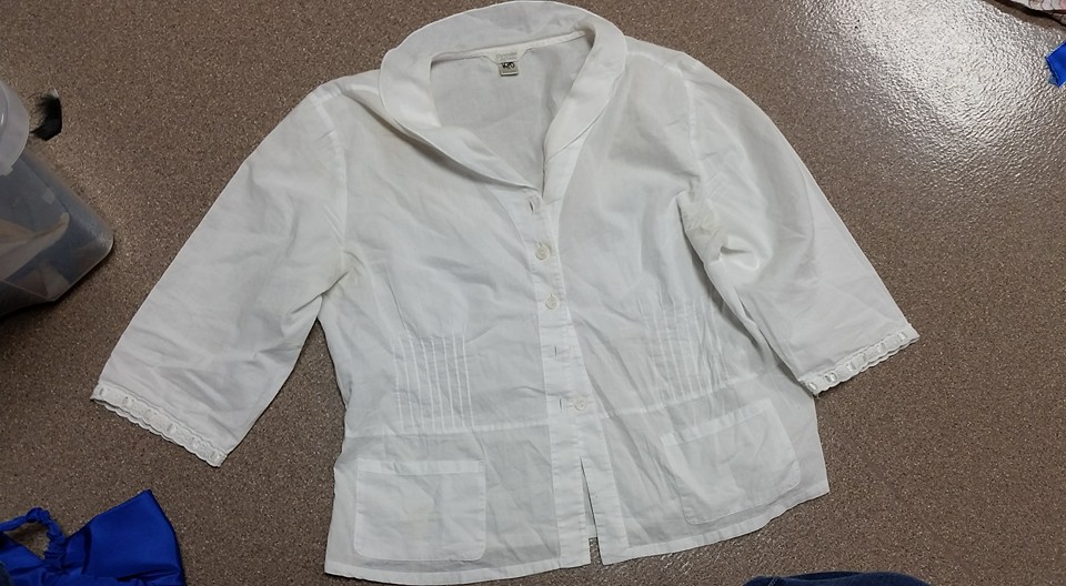 This outfit consisted of the jumper, blouse, two petticoats (one with eyelet and one poofy) and the apron. If I were constructing this from scratch, I would make this as a one piece outfit as the fast costume changes in the second act would be MUCH easier.