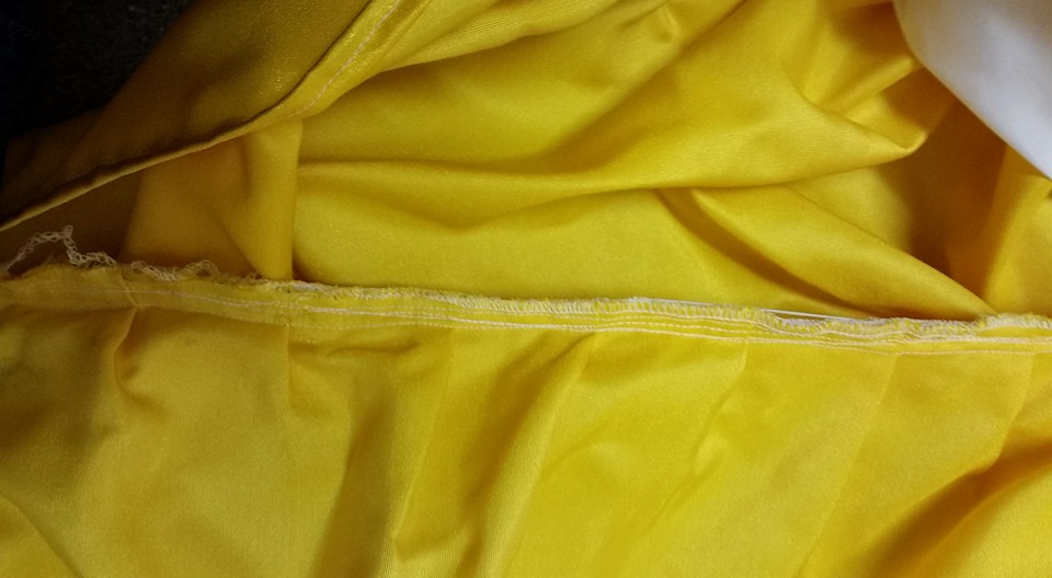 Creating the iconic yellow ball gown is not for the faint of heart or the inexperience sewer. It will also not happen without significant cost as a full ball gown like that will take a TON of fabric . . so, this is one garment I would definitely price out before deciding upon a course of action. We were very fortunate that we had a roll of heavy satin fabric just sitting in our marching band uniform closet left over from some long-ago project. We claimed it!