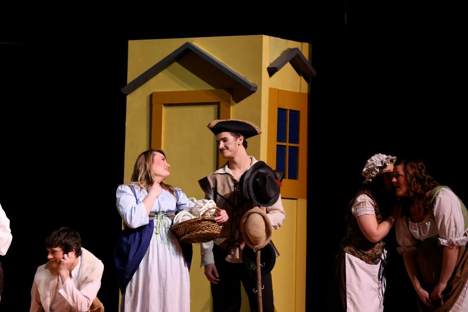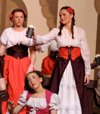 This is an example of matching corset vests. These were sewn from a pattern and were honestly awful. They seemed to be poorly designed, and the shoulders would not stay up. We ended up tying them together in the back with clear elastic. Two of these are fastened with lacing in the front, and the third has false lacing and is closed with a zipper in the back. The pink outfit has the zipper. It is actually a once piece dress as this cast member was also in the prologue so had a quick costume change. The green & orange vest outfits are separate peasant shirts, vests, skirts and petticoats. There are pro’s and con’s to both methods . . the one piece dress tended to look better, BUT, it is a very one dimensional costume, whereas the other two costume components can be used separately.