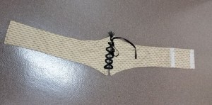 This is a fake waist corset. The waist corset could be made from a single piece of fabric. This one is constructed in two pieces that are joined by the ribbon “lacing”. It fastens in the back with hook and loop tape.