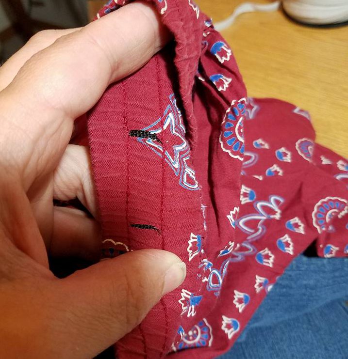 As mentioned in previous posts, I was making the costumes without knowing anything about the measurements of the cast members, so one of my goals was flexible sizing. The old elastic in the skirt was stitched into the waistband with several rows of stitches. Rather than mess with trying to remove and replace the elastic, I used the center row as a channel for a new drawstring. I cut two holes in the fabric and treated them with an anti-fray product. Then I simply pulled a string through, and that part of the skirt was done.