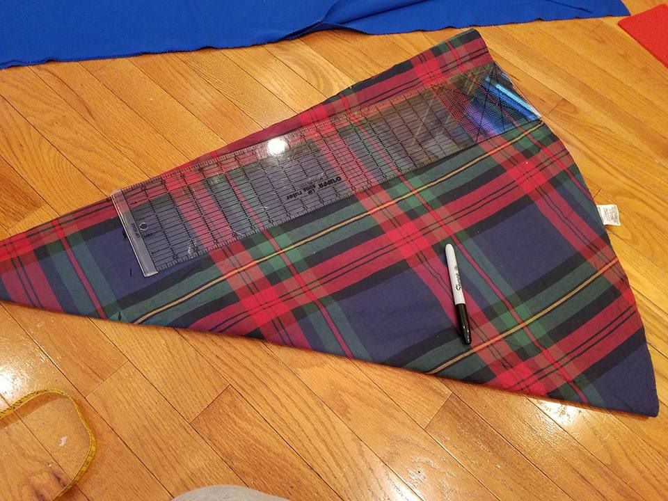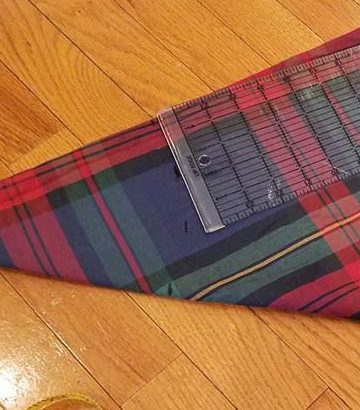 I began this project with a jewel toned plaid tablecloth. As mentioned, I folded the tablecloth in 1/8’s, and measured up from the bottom curved hem. I begin on the two sides, and work my way around. The second picture shows the marks where I will cut the point off. This line should be curved–if it is straight you will cut out a star, not a circle.