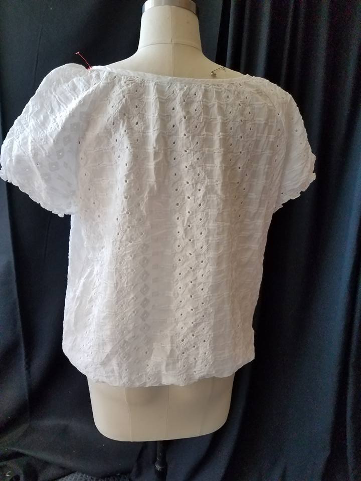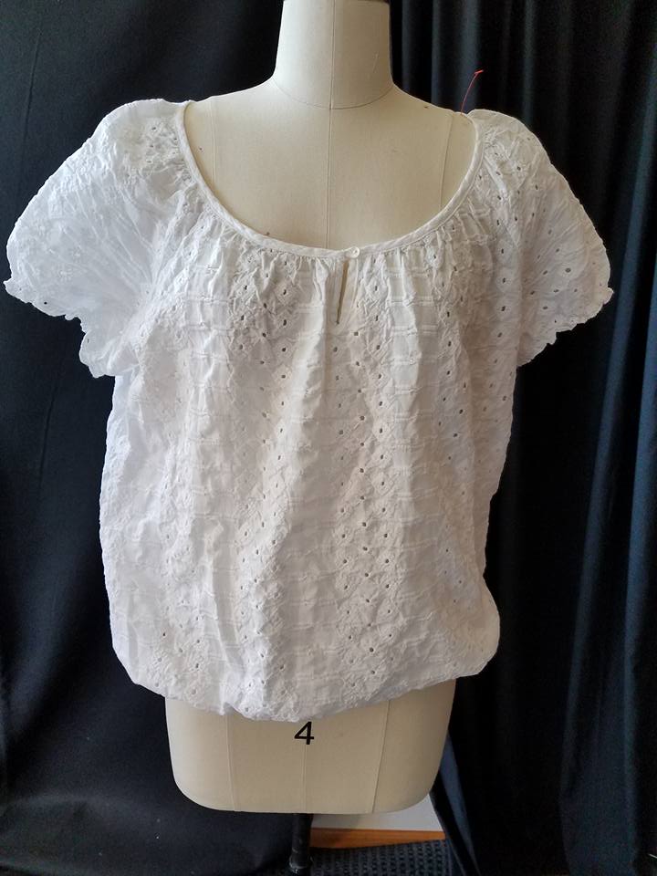 This was a simple peasant blouse. The neckline was bound and didn’t stretch. It had little cap sleeves with elastic, and eyelet fabric.