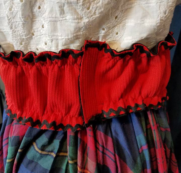 The front and back of the waistband were sewn together along the edges, and I trimmed it with black ric-rac. Hook and loop tape was used to close the back. Narrow black ribbon was threaded through the front tucks to create a mock laced look.