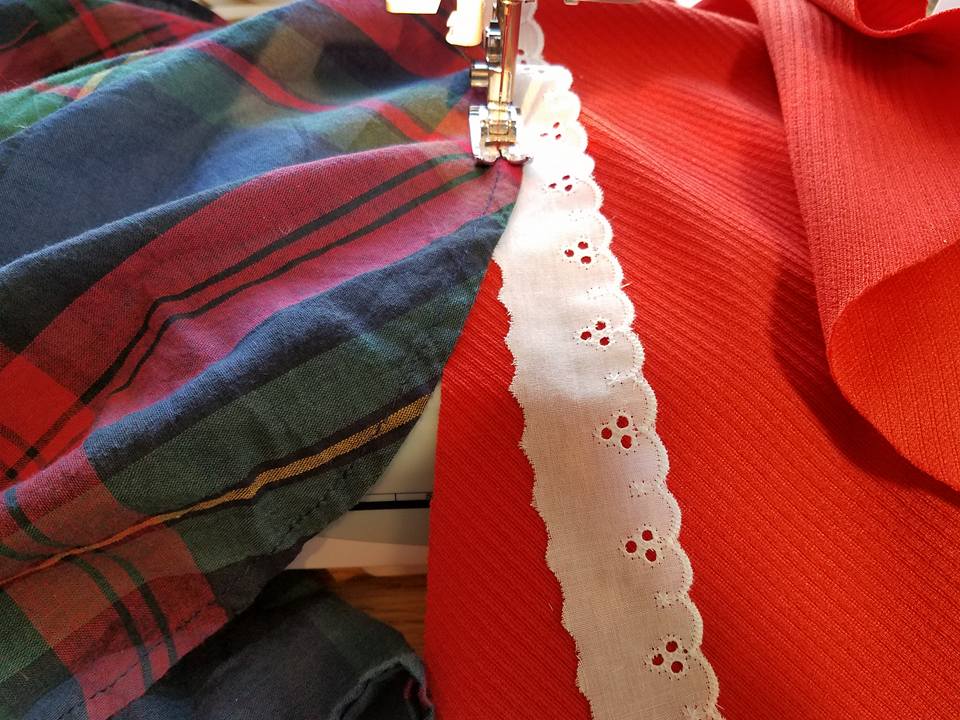 To make the bottom, I stitched the border pieces together to make one long curved strip. I inserted some eyelet into the seam as I went. The red is a knit, so no need to hem the bottom.