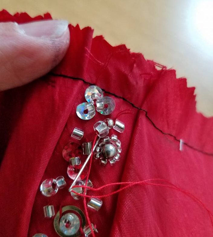 hand securing the beads where the threads were cut for the seams